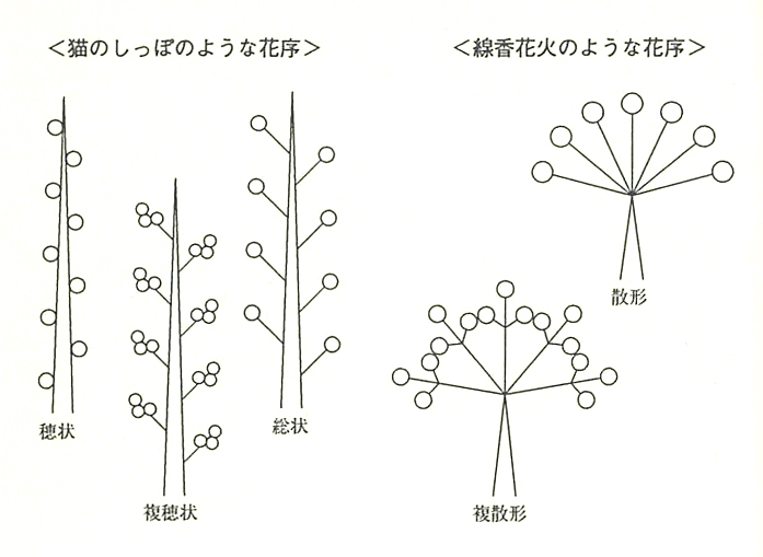 茎に付く花の配列の状態、花の枝が花序である。一つひとつの花の大きさや形、色などが千差万別であるように、花の枝にもいろいろな姿や形がある。