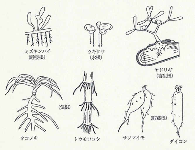 さて、はじめの根なし草と呼ばれる一種に、熱帯産のフクロカズラ(ディスキディア・ペクチノイデス)というつる植物がある。葉は貯水細胞が発達した袋状で、その空洞の中には土中にあるような根が充満している。雨期に貯水細胞に蓄えておいた水分を、乾期に少しずつ吸収して体全体に供給し、次の雨期までの命をつなぐ役割を果たすのである。これは、地中に根がない場合が多いからネナシカズラといってもよいだろう。このように水とか養分をくみ上げる役割は、根がもつもう一つの大切な機能で、私達が植物を育てるという立場からみて絶対に知って欲しい事柄といえる。この働きが正常に営まれるためには、根毛に酸素が常に供給されることが大切だ。