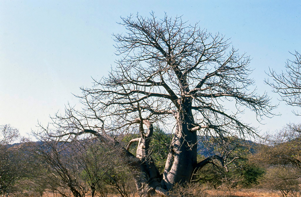 ここは降水量の少ない地域で、低木が混じった疎林や大草原が広がります。やや降雨のある時期には、植物は生長し緑色をしています。乾季になると樹木は落葉し、草は生気を失って枯れたように黄灰色に変わります。このような地帯の植物は、地上部は枯れますが枯死するわけではありません。地下部が肥厚したり、塊茎・球根などの貯蔵組織ができたりして、都合の悪い時季を乗りきる機能を持っています。