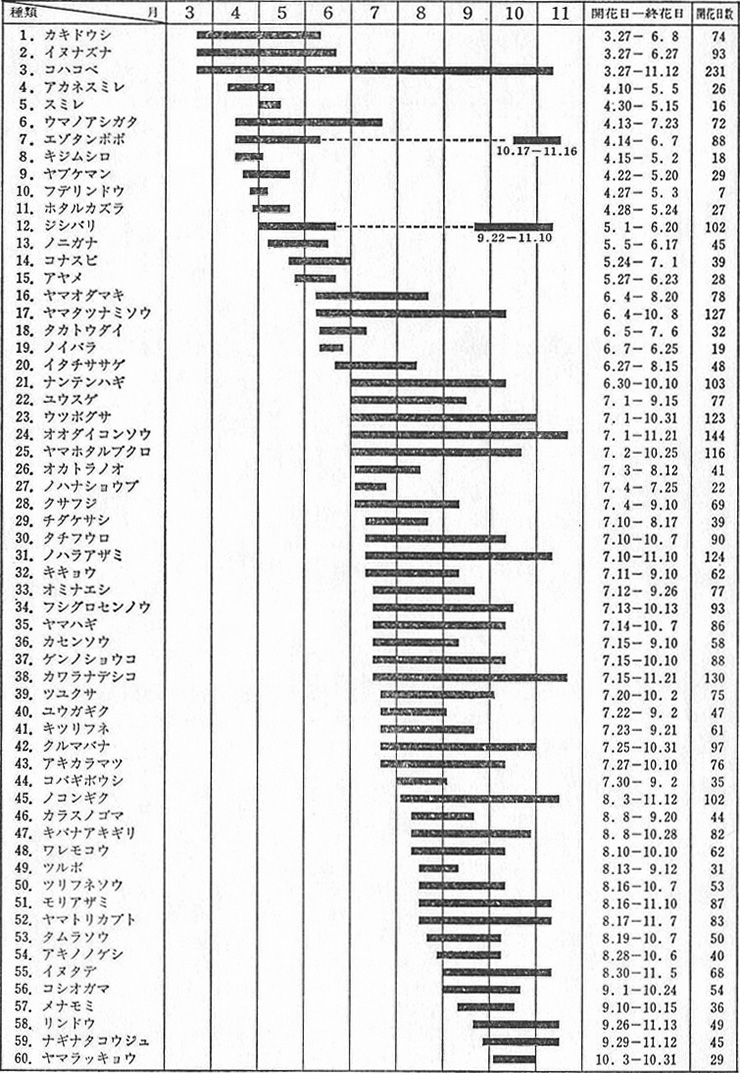 ここに60種の開花期間を別表にまとめた。表中、例えば、ウマノアシガタは四月十三日に開花し、七月二十三日に終花したとあるが、これは毎年四月十三日に開き七月二十三日に終ったということではなく、十年間のうちに最も早く開いたのが四月十三日であり、最も遅く終ったのが七月二十三日であったという意味で、他の種類についても同様である。開花期、終花期の遅速、開花期間の長短はその年の気候条件に左右されるのは当然であるが十日も二十日も狂うことはなく、大体は一週間以内におさまるようである。従って、この表に示された各種の開花日にプラス1~7日、終花日からマイナス1~7日が各年の実情となるわけである。なお、カキドウシ、イヌナズナ、コハコベの開花日は三月二十七日になっているが、実際はそれ以前に開花したに違いないが、その日から観察をはじめたことを意味している。