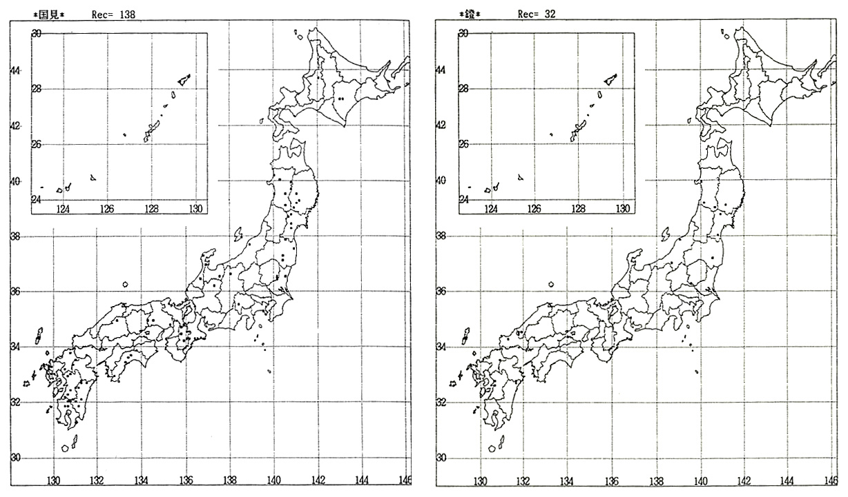 ところでこの日本全図は、グラフィック画面のハードコピーで、分布点の描画はアッという間だが、地図の描画は気のきかないプログラムなので時間がかかる。「こうやればもっと早くできる」とアドバイスしてくれる人はいるが、私は気にとめていない。手作業やプロッタで作業した頃にくらべれば、雲泥の差だからである。なにしろ眠っている間に百数十枚も作図できるのだから、これで十分である。
