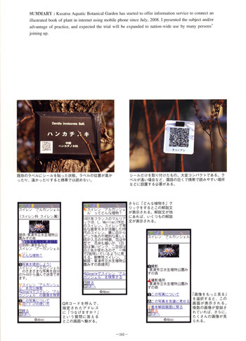 草津市立水生植物公園では、2008年7月より携帯電話を使った新しい情報サービスを開始した。これは、植物のラベルや、その周辺に取り付けたQRコードを携帯電話についているカメラで読み取るとインターネット上の植物図鑑に繋がり、携帯電話で情報を見ることができるというシステムである。まだ、全ての植物につけているというわけではないが、実際に運用を始めて気の付いたことも含めて紹介したい。